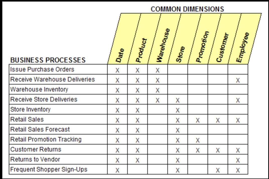 The Kimball Bus Matrix defines which conformed dimensions apply to each business process,